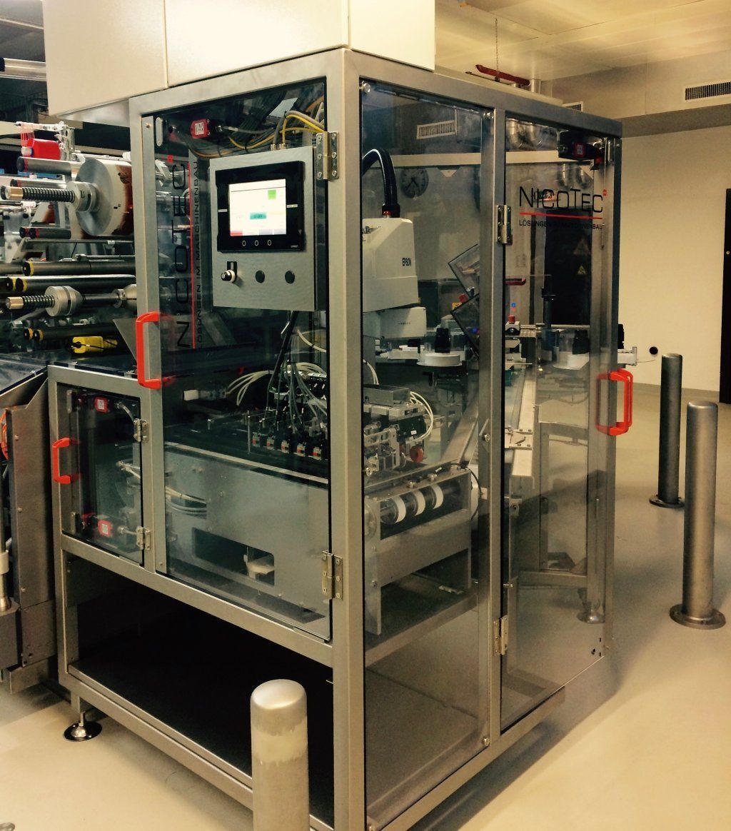 Die Ausricht- und Etikettierstation ALST übernimmt runde Biskuits die zuvor auf einer Rollpack-Maschinen verpackt worden sind. Diese werden mittels 8-fach Greifer auf einem Scara Roboter nach eingestelltem Winkel ausgerichtet und danach entsprechend dem gewählten Rezept etikettiert. Die Anlage verfügt über einen Automatik Modus und einen Handeingabe Modus.