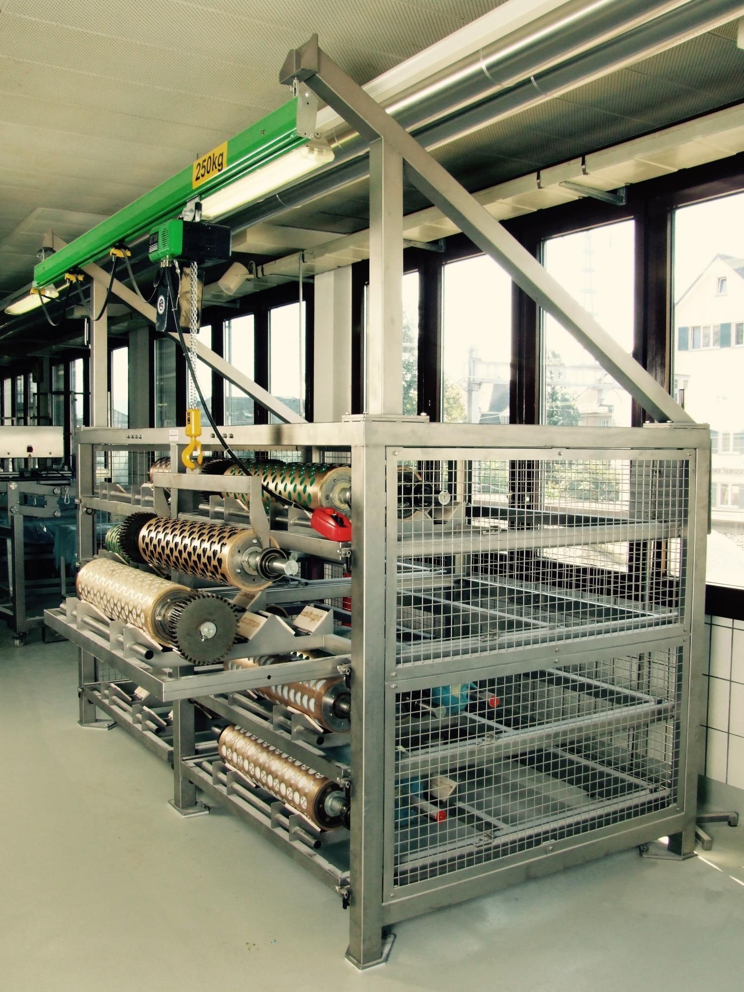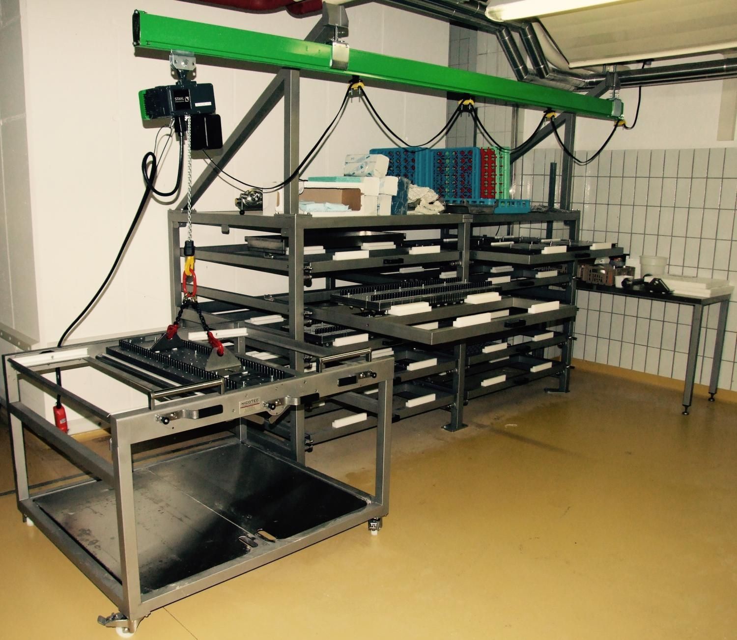 - Lagergestell mit integriertem Kransystem, Transport- und Reinigungswagen