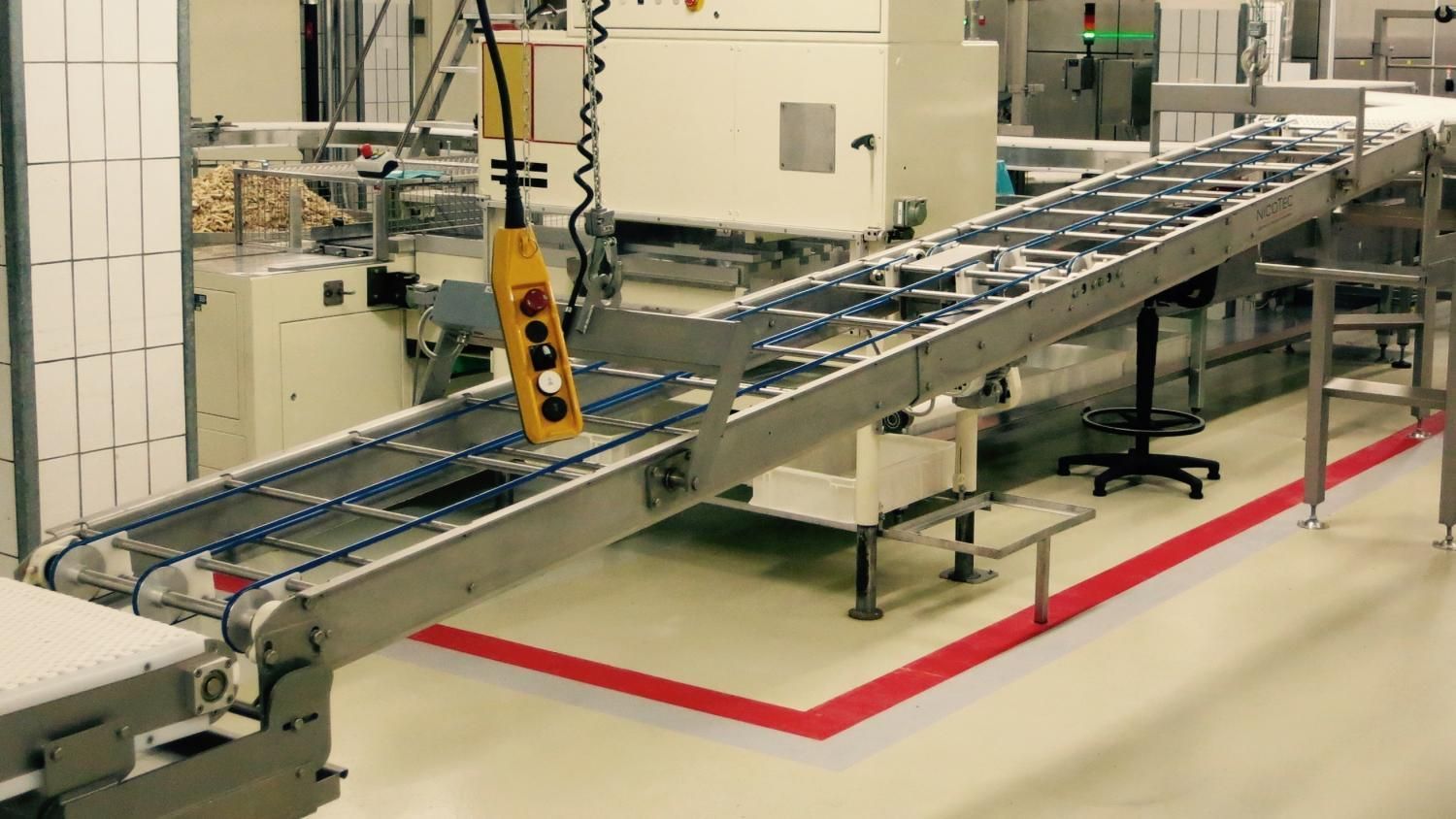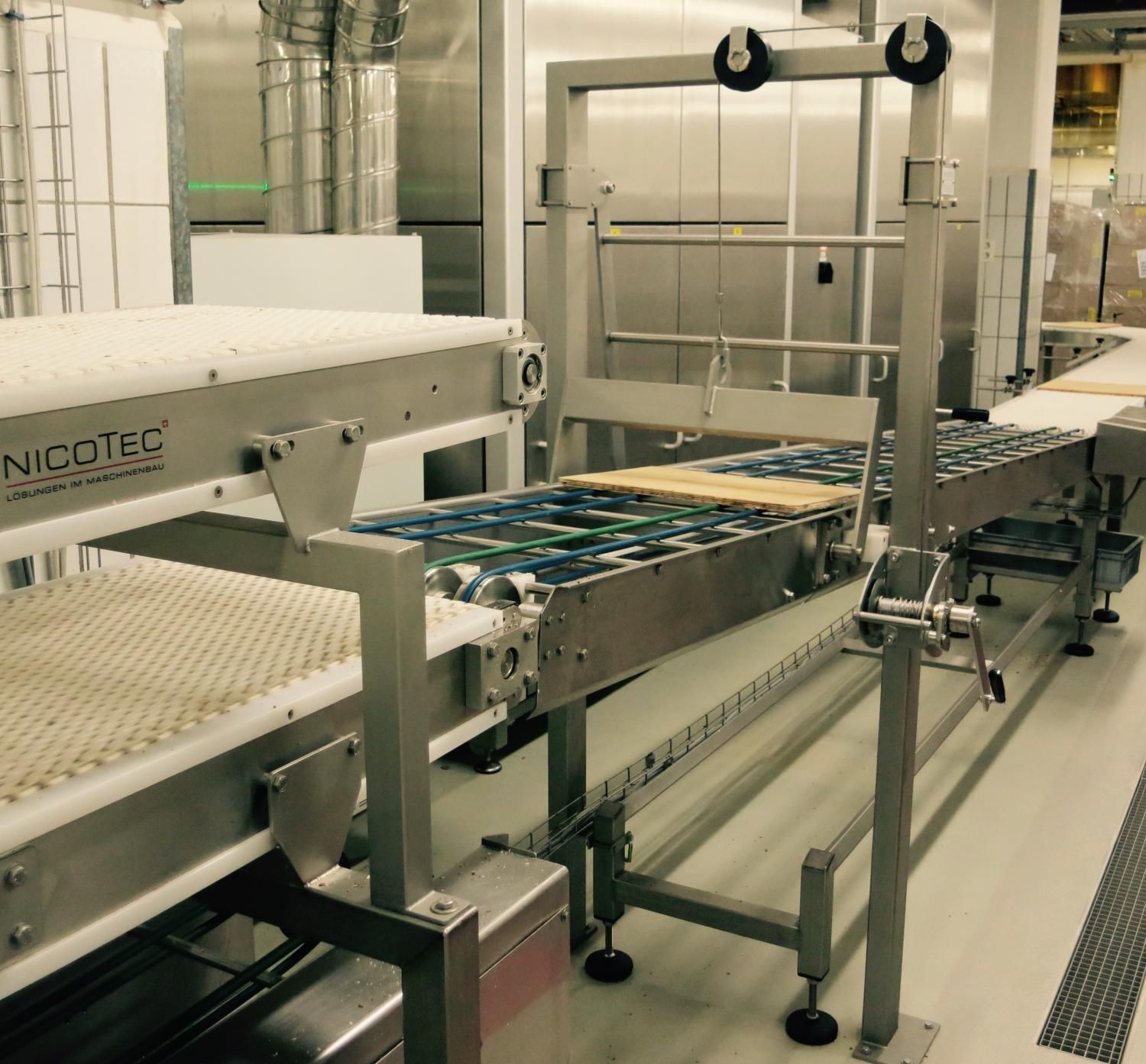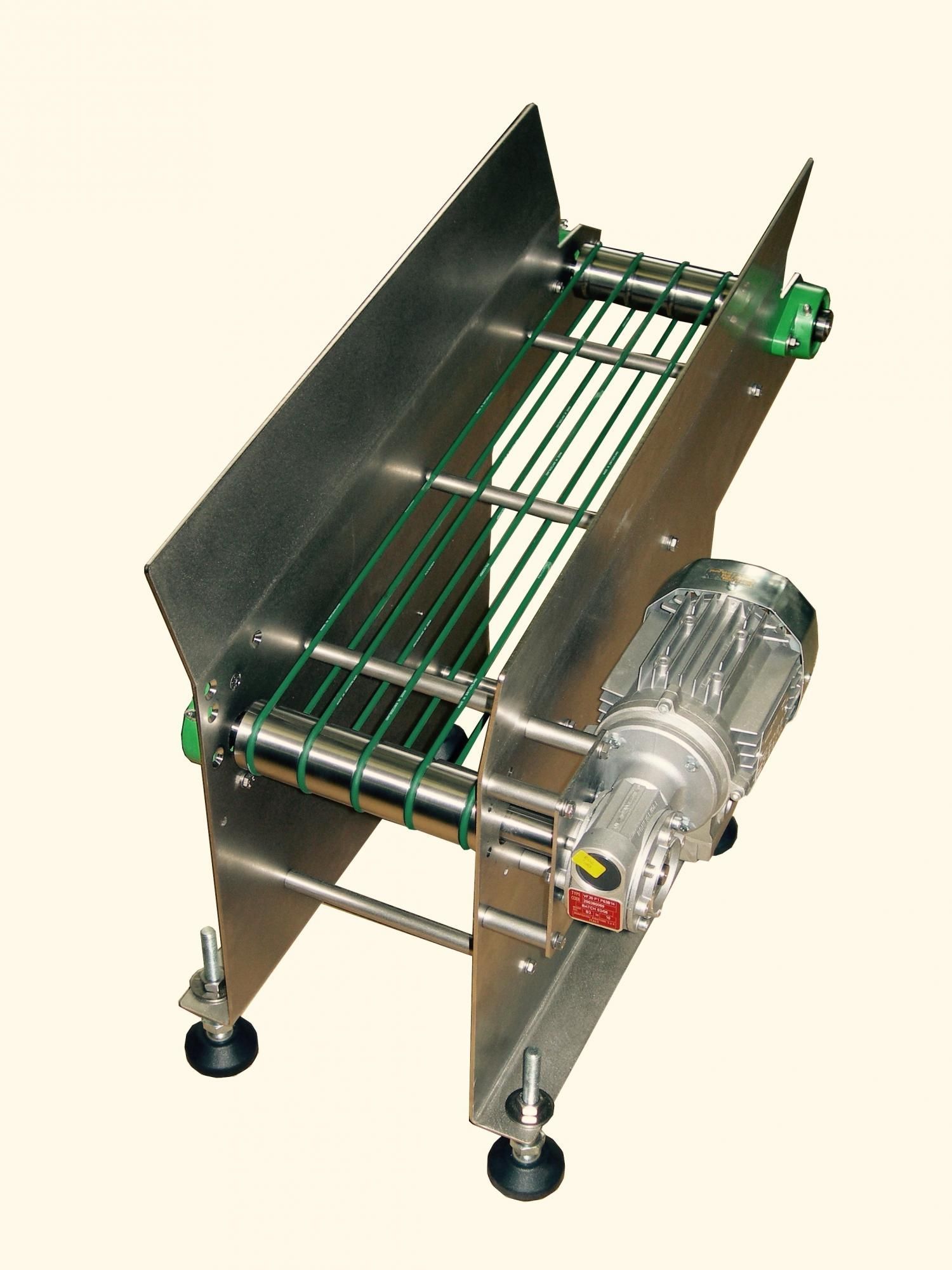 Riemenförderer mit Leerraum zwischen mehreren Riemen kommen dann zum Einsatz, wenn ein Produkt von der Unterseite bedruckt oder gestoppt werden soll. Sie ermöglichen auch das „Belüften" (Abkühlen, Erwärmen) oder das Dämpfen des Förderguts.