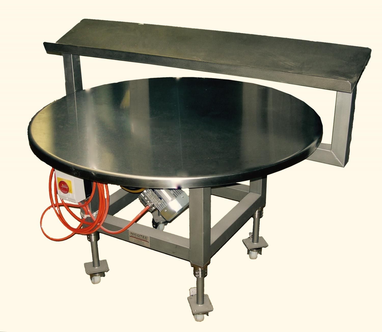 Der Nicotec Rundtisch RT dient als Zwischenspeicher, zum Ändern der Richtung oder zum Ausschleusen von fehlerhaften Teilen. Er wird in der Verpackungsindustrie oder Fördertechnik eingesetzt.
