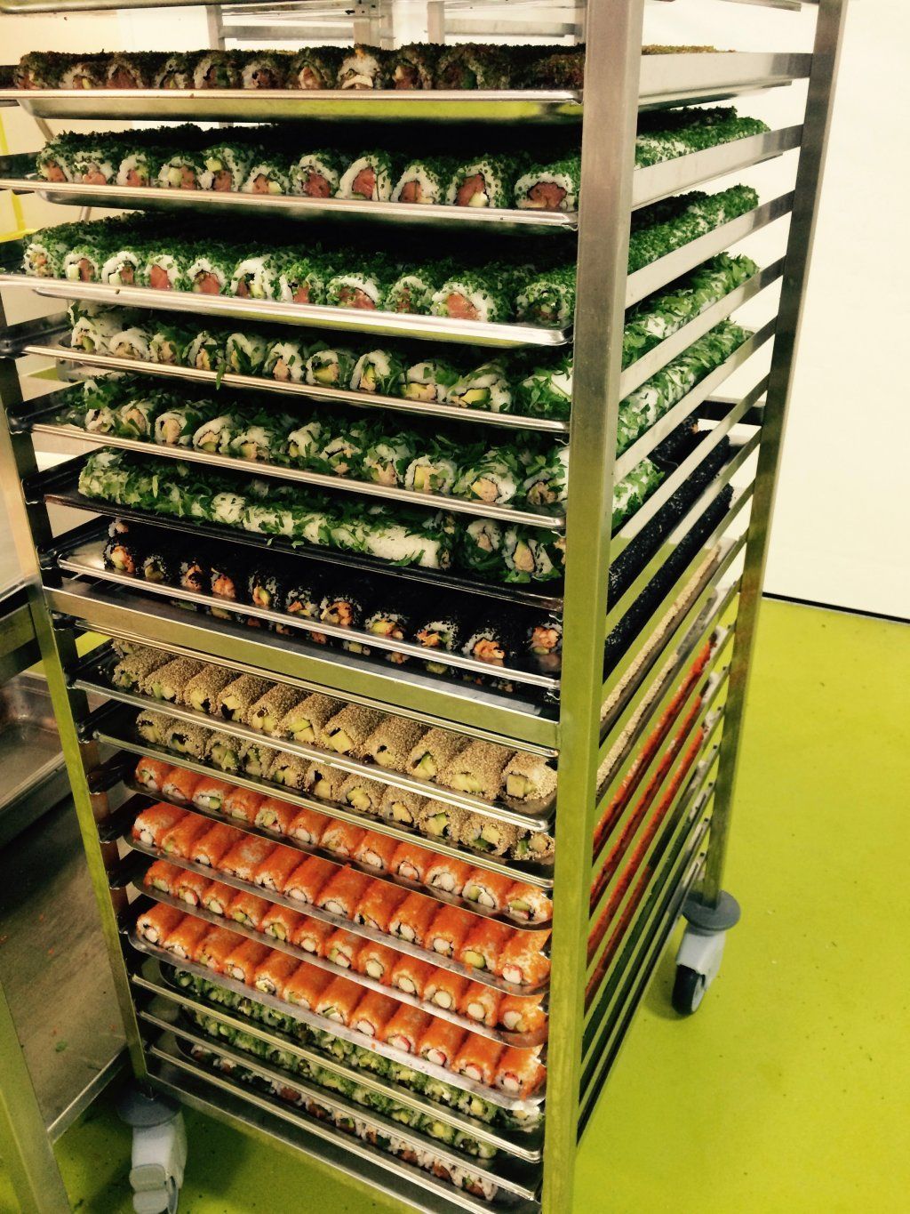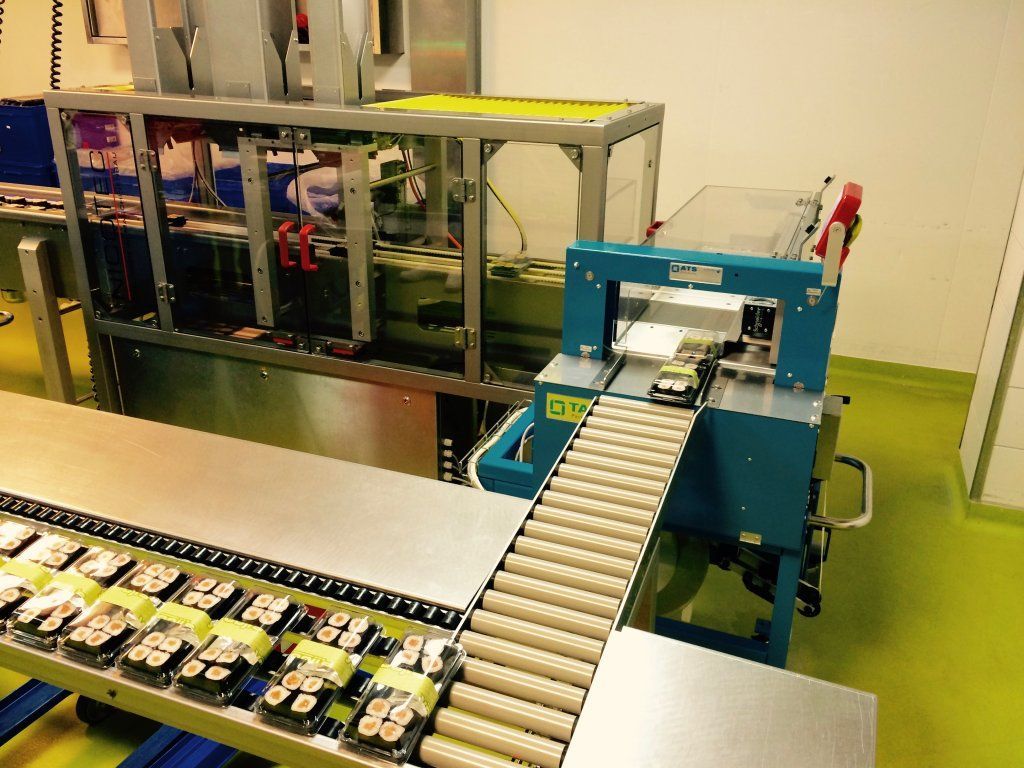Sie besteht aus einem Tray-Modul (Speichersystem von verschiedenen Tray-Formaten und automatischem Trayabstapler), einem Sushibelegungsbereich (die Trays werden von Hand mit Sushiprodukten bestückt), einem Cover-Modul (Speichersystem von verschiedenen Cover-Formaten und automatischem Coverabstapler), einer Banderoliermaschine, einer Etikettierstation (Etikette mit Produkinformationen wird von unten an die fertige Box angebracht) und einem Boxspeicher.