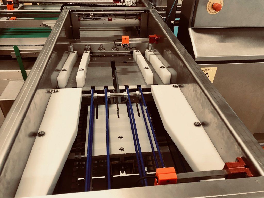 Der Waffelschneidetisch WST schneidet Waffelblätter in gleichmässige Wäffeli. Nach dem Schneidevorgang wird jedes zweite Wäffeli über eine Stopper zurückgehalten. Dies wird gemacht damit die Wäffeli sich gegenseitig nicht berühren und der Schokoladenauftrag einwandfrei läuft. New Parag