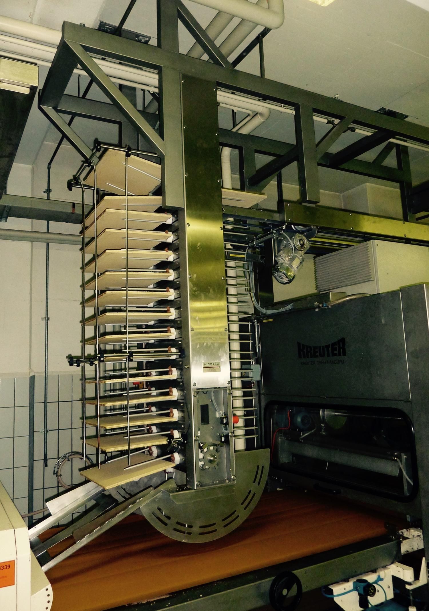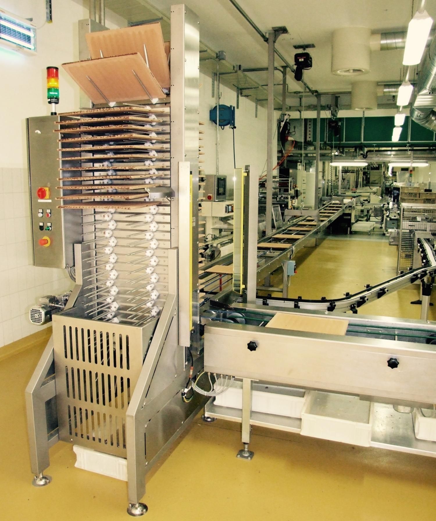 Der Waffelvertikalförderer dient zum spannungsfreien Abkühlen der Waffelblätter durch die Umgebungstemperatur nach dem Backen und vor dem Streichen oder Konditionieren. Weiter dient er zum vertikalen Transport von Waffelblättern oder -blöcken innerhalb einer Waffelproduktionslinie.